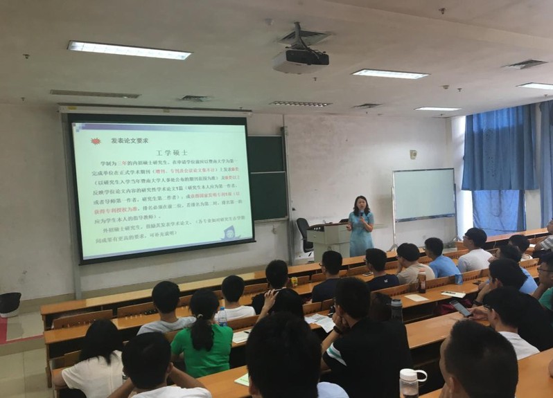 随后,副院长李红教授做了学位与研究生培养相关政策宣讲。李红教授指出,同学们要熟悉研究生学籍培养系统,并认真遵守研究生培养规定。她着重强调了理工科研究生发表论文的要求。此外,她还介绍了暨大的特色出国出境进修项目,并提醒研究生同学要给予密切关注。