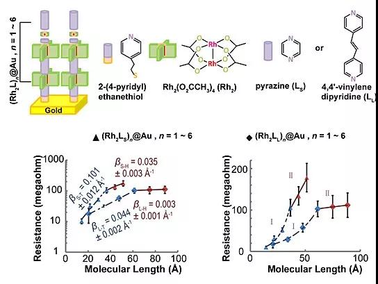 vwin德赢ac米兰官网刘春元教授课题组以自组装膜为模板,利用分步组装方法,在金电极表面制备了一系列长度和结构可控、含键合双铑单元(Rh2(O2CCH3)4)并具有很小的距离衰减因子的分子导线(β =0.003 Å-1)。该项研究验证了随着分子导线的延长,电荷传输机制从隧穿(Tunneling)转换为跳跃(Hopping),同时发现,对不同结构的分子导线,机理转换均发生链节数相等(n = 4)但长度不同的节点上,由此认为Rh2中心起到了电荷(电子或空穴)跃迁的垫脚石(Step stone)作用。更重要的是,比较分子骨架相似、耦合作用不同的两个体系,发现金属中心之间耦合作用较强的分子导线具有较大的电阻以及较大的电阻随分子长度变化的衰减常数(β)(图1),故其导电性能反而低于弱耦合的导线。DFT计算表明,由键合Rh2单元与有机π桥配体构造的金属-有机杂化分子导线通过π(Rh2)–π(L)轨道作用,形成了与有机炔苯低聚分子相似的π共轭体系,长桥配体(LL)虽然减弱了分子导线金属中心之间的耦合作用,同时也降低了HOMO-LUMO能级差,因此更利于电荷在金属中心间的跃迁,从而实现长程电荷传导。