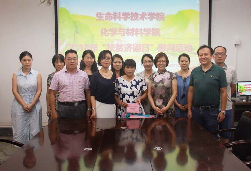 2018年7月4日下午,vwin德赢ac米兰官网党委和生命科学技术学院党委在生科院会议室举行“扶贫济困日”慰问活动,对扶贫对象——来自广东南雄市水口镇篛过村帮扶户刘景英进行了慰问。化材院党委书记邵桂珍、生科院党委李弘剑书记和生科院党委代表参加了活动。
