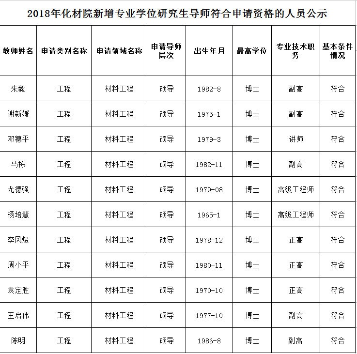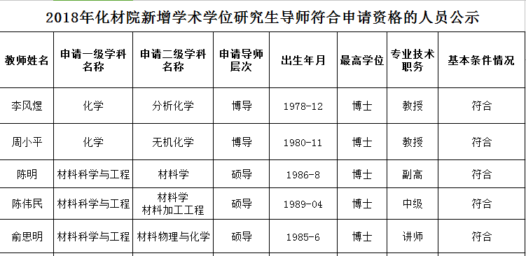 根据《vwin德赢ac米兰官网关于开展2018年新增研究生指导教师遴选工作的通知》及《《vwin德赢ac米兰官网研究生指导教师遴选与认定办法》(暨学位〔2017〕33号)》,我院作为化学、材料科学与工程、材料工程一级学科或专业类别所属学院,已于上学期末已完成对各申请人相关材料的收齐、汇总和基本审核。