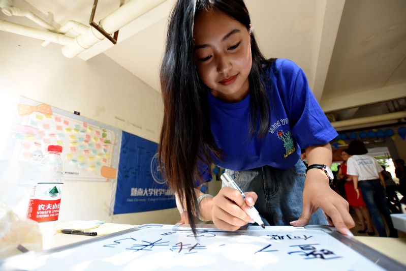 来自广西的18化学工程与工艺专业的农富斌,在迎新现场秀起绝活——转笔,吸引了大量崇拜的眼神。作为一种释压手段,转笔丰富了他的课余生活,据了解,农同学曾在国内转笔比赛中获奖,并参与央视节目的演出,他说,自己从小学开始,就凭着兴趣将转笔融入生活与学习。新的学期他会参加各种课余活动,“我会一些电脑技术,希望能在各方面提高自己”。