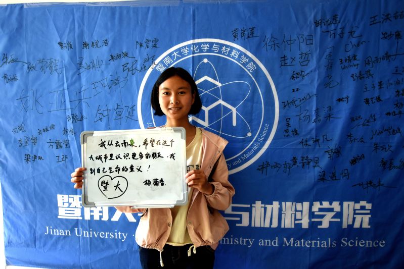 来自云南的应用化学(创新班)的杨菊香,是一个白族女孩,“在这边读书还是会比较想家,但是这边有学长学姐,还有同学,我想我一定会慢慢适应的。”来到广东读书,她想要认识更多的人,更多的事物,“我会慢慢地在学习中逐步找到自己的目标,并为之努力”。