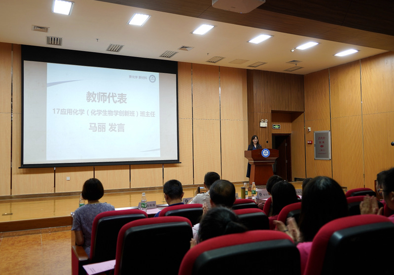 紧接着,化材院副研究员、2017级应用化学(创新班)班主任、2016年香港科学会“青年科学家候选人”马丽老师上台发言,她以“金秋送爽,丹桂飘香”开篇,回忆起自己从本科到博士的成长历程,叮嘱同学们继续发扬高中时期枕戈待旦的拼搏精神,不要浪费青春,要认准目标、谨慎选择,努力在大学学会守忠义、讲道德,学会尊重、学会做人。