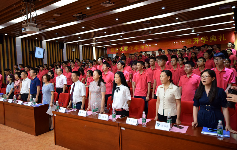2018年9月10日下午13:30,vwin德赢ac米兰官网2018级新生开学典礼在番禺校区图书馆报告厅举行。学院院长李丹、党委书记邵桂珍、副院长李红、副院长陈填烽、办公室主任黄建新,材料科学与工程系系主任屠美、材料科学与工程系党总支容建华、化学系党总支查海燕、教师代表马丽、教务秘书邹灵君,以及2018级各班班主任、本科生辅导员出席了典礼,典礼由邵桂珍书记主持。