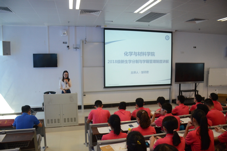 什么是学分制?满足什么条件才能正常毕业?如何科学地选课与提升绩点?出现挂科会造成哪些严重后果?化材院的培养方案如何解读?哪些事情应该找辅导员/教务秘书?针对刚刚经过高考进入大学的2018级新生,邹灵君以学长们鲜活的案例为各位同学细心解答了这些疑惑,各位新同学首次接触大学学制相关知识,时而托腮认真聆听、时而手捧学生手册仔细阅读、时而侧身相互讨论,一个个聚精会神,生怕错过某一细节。