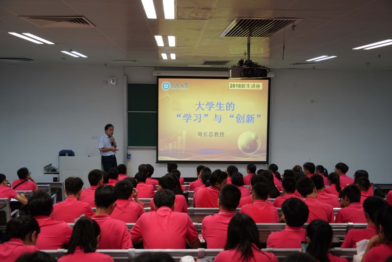 2018年9月12日19:00,化材院名师周长忍教授在番禺校区N113课室,为学院2018级全体新生带来一场别开生面的“大学生的‘学习’与‘创新’”讲座,辅导员孙嘉恒担任讲座主持。