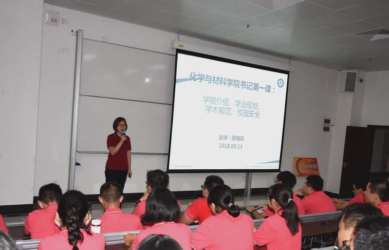 2018年8月13日是本科新生训练营的第4天,武术训练后,化材院的“小苹果”们早早齐聚教学楼N114,共同期待学院党委邵桂珍书记为他们精心准备的第一课——“学术规范、学业规划及校园安全”,8点30分全场座无虚席,“第一课”正式开始。