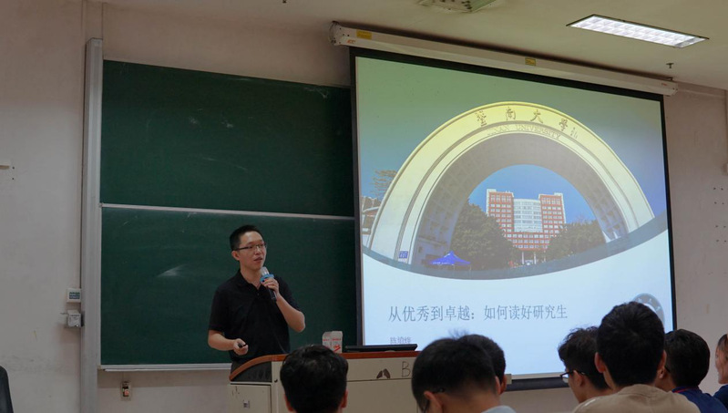 9月12日下午3点,化材学院副院长陈填烽教授于富力教学楼A124展开题为“如何成为一名优秀的研究生”的主题讲座。讲座中,陈院长以生动幽默的语言和精彩丰富的PPT展示,对研究生新生如何安排学习生活提出了建议。首先陈院长向大家讲述了专业与方向的选择问题,指导新生如何确立自己的人生目标,紧接着陈院长告诉大家,目标确定后,就要坚持走自己的路,从优秀走向卓越,最后陈院长提醒各位新生要培养好的学习习惯,比如养成记笔记的好习惯,同时要学会感恩,不忘初心。同学们认真聆听,积极反应,整场讲座气氛轻松愉快。