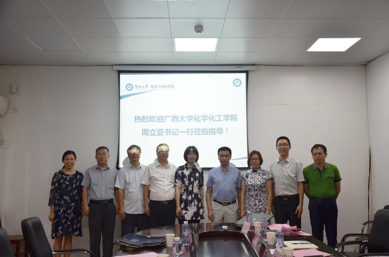 9月18日上午,广西大学化学化工学院党委书记、常务副院长周立亚、副院长段文贵、化学系书记廖森、应化系主任李光华一行4人来vwin德赢官网调研,vwin德赢官网院长李丹、党委书记邵桂珍、副院长陈填烽、学院办公室主任黄建新、化学系系主任李毅群、化学系党总支书记查海燕参加座谈。