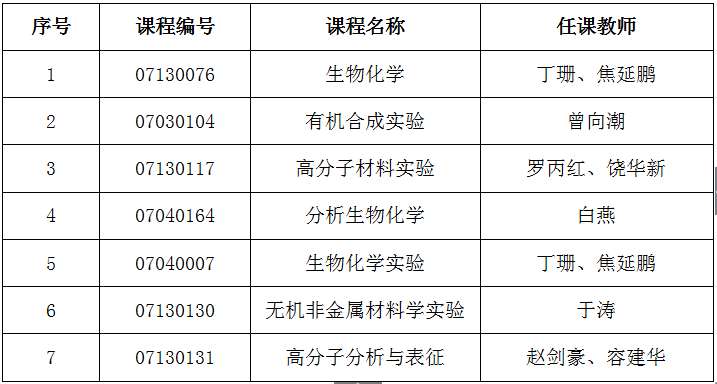 2017-2018学年第二学期,学校教务处组织全校学生进行了课程评估。vwin德赢官网共开设有66门课程,其中《生物化学》(任课教师:丁珊)等7门课程获评优秀,现将优秀课程名单予以公布: