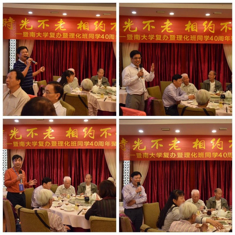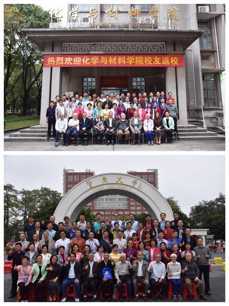 离开化学楼后,校友与老师们在学校正门合影留念。晚宴上,杨耀钦、黄雅敏、黄汉逵和李建龙四位校友分别代表同学们向母校以及恩师表达了最真诚的问候与祝福。最后在一片欢声笑语中,结束了今天的活动。