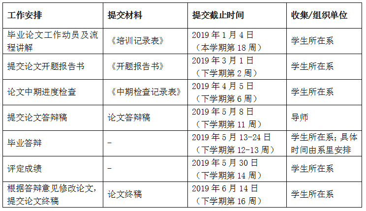 两系应在本学期第18周前完成毕业论文工作动员及流程讲解工作,在2019年1月4日前(18周周五)提交相应《vwin德赢ac米兰官网本科毕业论文工作动员及流程讲解记录表》(附件12)。