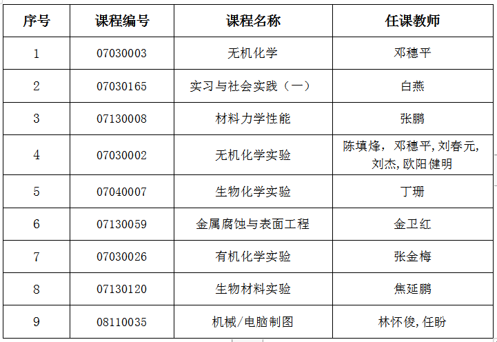 2018-2019学年第一学期,学校教务处组织全校学生进行了课程评估。vwin德赢官网共开设有74门课程,其中《无机化学》(任课教师:邓穗平)等9门课程获评优秀,现将优秀课程名单予以公布: