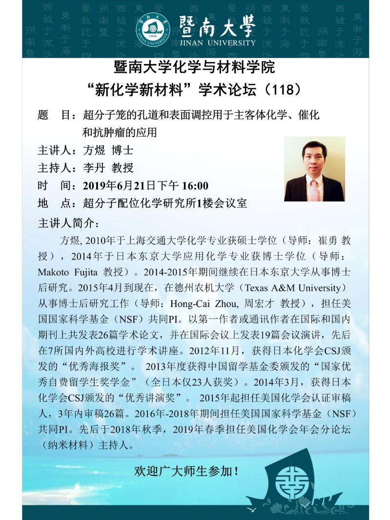题目:超分子笼的孔道和表面调控用于主客体化学、催化和抗肿瘤的应用