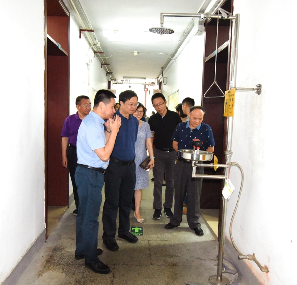 7月4日上午,我校校长宋献中,副校长饶敏、张荣华,校长助理王志伟带队来vwin德赢官网检查实验室安全工作。党政办主任孙彧、实验室与设备管理处处长徐石海、工会委员会常务副主席侯宏伟、总务后勤管理处处长黄沿忠、保卫处处长杨广生等相关人员参与检查。学院院长李丹,党委书记邵桂珍,副院长李红、陈填烽,学院办公室主任黄建新接待了前来视察的宋校长一行。