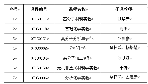 2018-2019学年第二学期,学校教务处组织全校学生进行了课程评估。vwin德赢官网共开设有63门课程,其中《高分子材料实验》(任课教师:饶华新)等7门课程获评优秀,现将优秀课程名单予以公布: