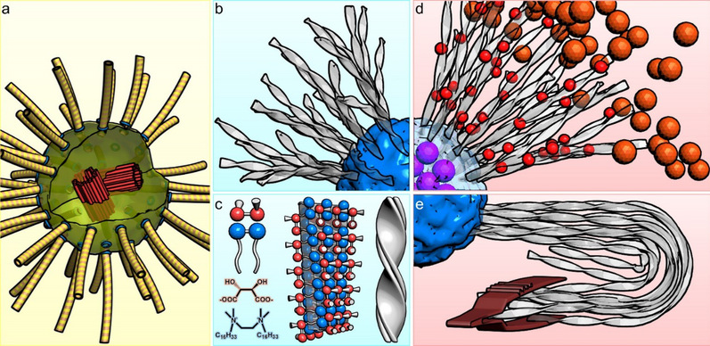 在细胞中,微管星状体作为放射状骨架起到定位支架的作用。不同细胞器的定位是通过微管上的运动/锚定蛋白来实现的;例如,高尔基体通常位于中心体附近,内质网遍布整个细胞质,某些信号蛋白被转运到星状体的外周。作者发现他们制备的仿生星状体可以根据微纳粒子的表面化学性质和尺寸自发的将它们定位在不同位置,例如星状体的核心、丝带间和丝带外边缘处。其中,A型是参与星状体成核的疏水颗粒,因此保留在核中,而所有亲水粒子(B至D型)均从核中排出。B型是沿着微丝分布的小颗粒, C型是中等大小的颗粒,几乎不能容纳在内圈附近, D型粒子最大,仅沿外周分布。在细胞中,微管星状体作为弹性骨架提供机械强度。而作者报道的仿生星状体具有良好的弹性(杨氏模量~5Kpa),微丝能够被来回弯曲180°而不折断。这些星状体还能被组装成高级结构,承受更大的形变。