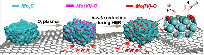 该工作通过O2等离子体刻蚀,可控构筑Mo2C-MoOx异质结构。电化学测试发现,Mo2C-MoOx的析氢活性随着扫描次数(或时间)增加而逐步提升,预示了表面重构对提升活性的重要作用。电化学-Raman原位表征表明MoVIOx被原位还原成MoIVO2,形成了Mo2C-MoIVO2界面活性位。DFT计算证明该界面有效降低了Mo-Hads的键能,克服了生成H2的能垒;并确定Mo2C表面Mo=O相邻的Mo位点是工作环境下的活性位,澄清了长期以来的模糊认识。进而,利用该规律认识,调控并优化表面氧化程度,获得优异的酸性HER性能。如在1.0 M HClO4电解液中,该催化剂仅需60 mV过电位即可达到-10 mA cm-2电流密度,优于目前报道的大多数非贵金属催化剂。同时,工作还在W2C-WOx/CC体系证明了类似的原位表面重构过程,以及对催化活性的显著促进作用,说明了该作用机制在碳化物电催化剂中的普适性。
