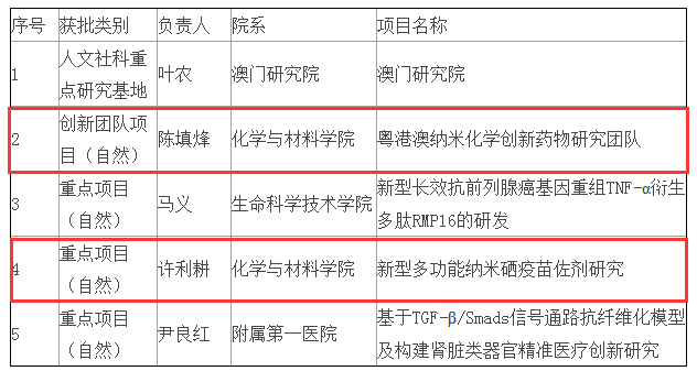 近日,广东省教育厅公布了2019年度普通高校重点科研平台和项目立项名单,我校科研平台和项目共立项5项,其中,vwin德赢官网立项2项。包括由陈填烽教授负责的创新团队项目“粤港澳纳米化学创新药物研究团队”和许利耕教授负责的重点项目“新型多功能纳米硒疫苗佐剂研究”。
