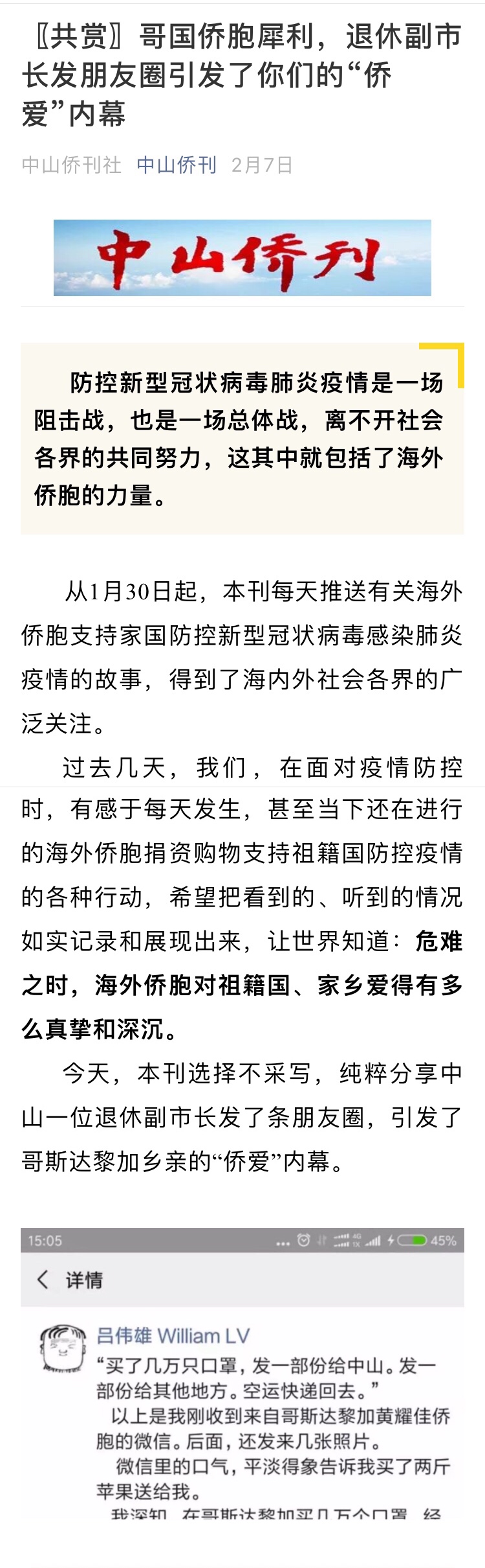 2月19日,一批由“哥斯达黎加华侨华人紧急抗疫募捐小组”、哥斯达黎加华侨华人华裔协会、旅哥中华总会、旅哥中山联谊会、中山协会、Puntarenas中华会馆、Santa Crus 中华会馆、Nicoya 中华会馆等哥斯达黎加华人组织共同筹集的50万个具有美国、欧盟以及ISO认证的一次性医用口罩抵达中山港外运码头。在哥斯达黎加组织的募捐共筹集了折合人民币近十五万元的捐款,这一倡议就是由黄耀佳校友等侨领首先提出的,而这批口罩的采购,也是在黄耀佳等人的大力推动下艰难完成的。中山侨刊对此事进行了专题报道。