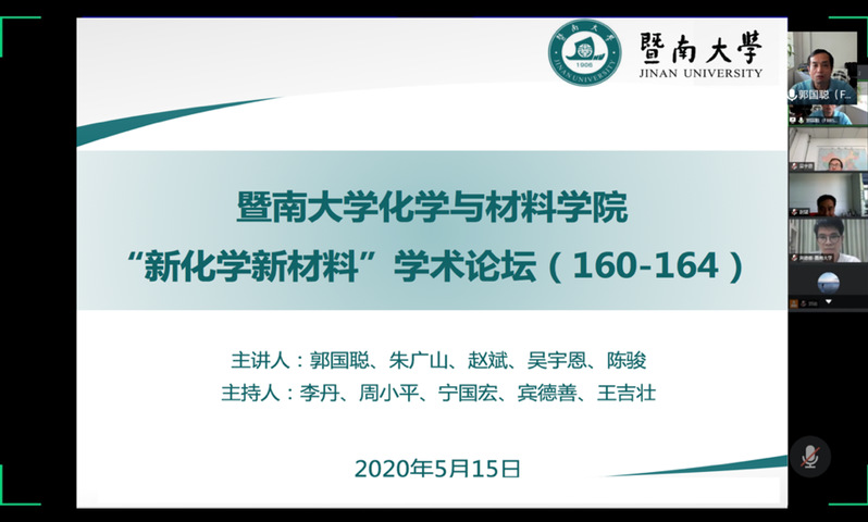 2020年5月15日,vwin德赢ac米兰官网第160-164期“新化学新材料”学术论坛在线上成功召开。此次论坛邀请了中科院福建物质结构研究所郭国聪教授、东北师范大学朱广山教授、南开大学赵斌教授、中国科技大学吴宇恩教授以及北京科技大学陈骏教授作学术报告,vwin德赢官网70余名师生参加了论坛。受疫情影响,本次论坛采用线上形式进行。