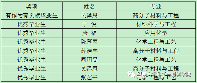 获奖情况:优秀学生二等奖学金(校级);“科顺股份•常春藤”奖学金(校级);黄乾亨奖学金(校级);毕业班优秀学生一等奖学金(校级);“优秀学生”荣誉称号(校级);“院优秀团支书”荣誉称号(院级);“校十佳团支书”荣誉称号(校级);“优秀共青团干部”荣誉称号(校级);“毕业生优秀共青团干部”荣誉称号(校级);广东省材料创新大赛高分子赛区“二等奖”(省级);赢在创新一期“最受欢迎奖”(校级);赢在创新决赛“特等奖、最佳项目奖及最受欢迎奖”(校级);毛概课展示大赛校级三等奖。