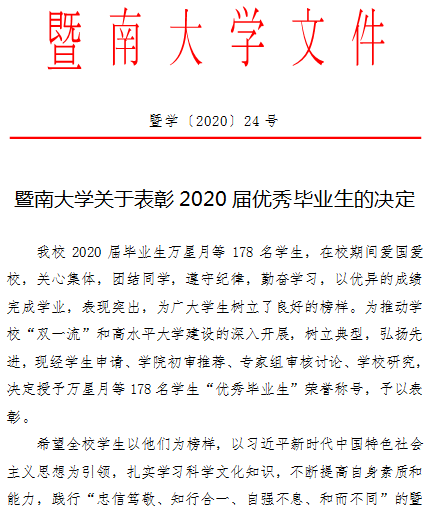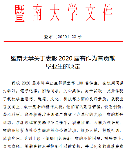 获奖情况:美国大学生数学建模公开赛国际级一等奖(国际)、国家奖学金(国家级)、广东省材料创新大赛二等奖(省级)、南风窗调研大赛全国百强(国家级)、vwin德赢ac米兰官网“暨南好班长”标兵奖、“进取之星”标兵奖、“暨南之星”提名奖(校级)、“科顺·常春藤”“优秀学生一等”、“优秀学生干部”、毕业生“优秀学生干部”奖学金、“优秀学生干部” “优秀学生”“优秀共青团员”“优秀班长”、新生训练营“优秀学生干部”、“优秀营员”、“优秀兼职辅导员”荣誉称号、概论课展示大赛校级三等奖(校级)、vwin德赢ac米兰官网“双有”毕业生(校级)