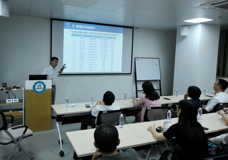 李丹院长介绍了重点实验室的研究方向、队伍建设、人才培养目标、学术委员会工作进展、管理及开放运行等方面情况。广东省功能配位超分子材料重点实验室面向国家及广东省的重大战略需求,以超分子设计合成及配位组装行为规律与相关材料功能性质为基本科学研究主体,开展产学研全链条科学与技术研究。