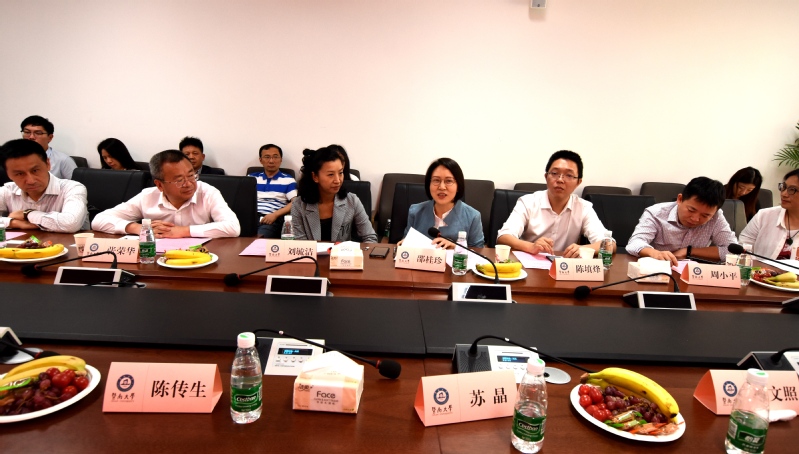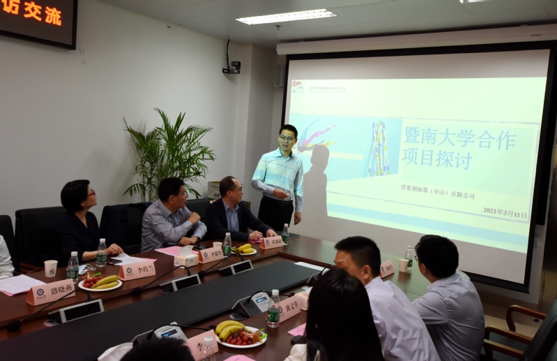 在2022会议室,食品系胡长鹰教授与叶氏化工集团的技术人员简要介绍了各自的单位背景和研究方向,就油墨在包装材料的整个使用生命周期中的非有意添加物迁移、痕量检测,光引发剂在包装物中的迁移、水性油墨等方面进行深入交流,探讨合作方案。双方还就与暨大珠海包装研究所合作,建立食品接触材料实验室达成一致意见。