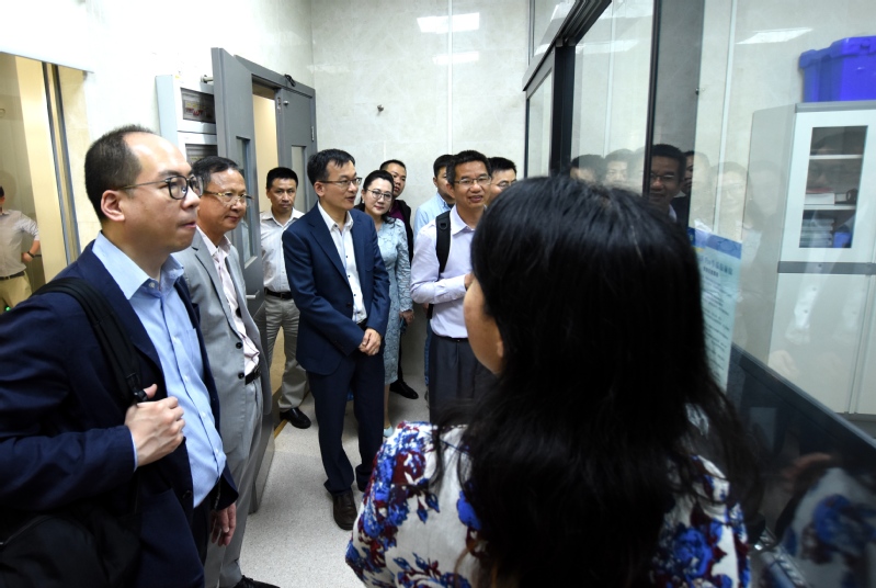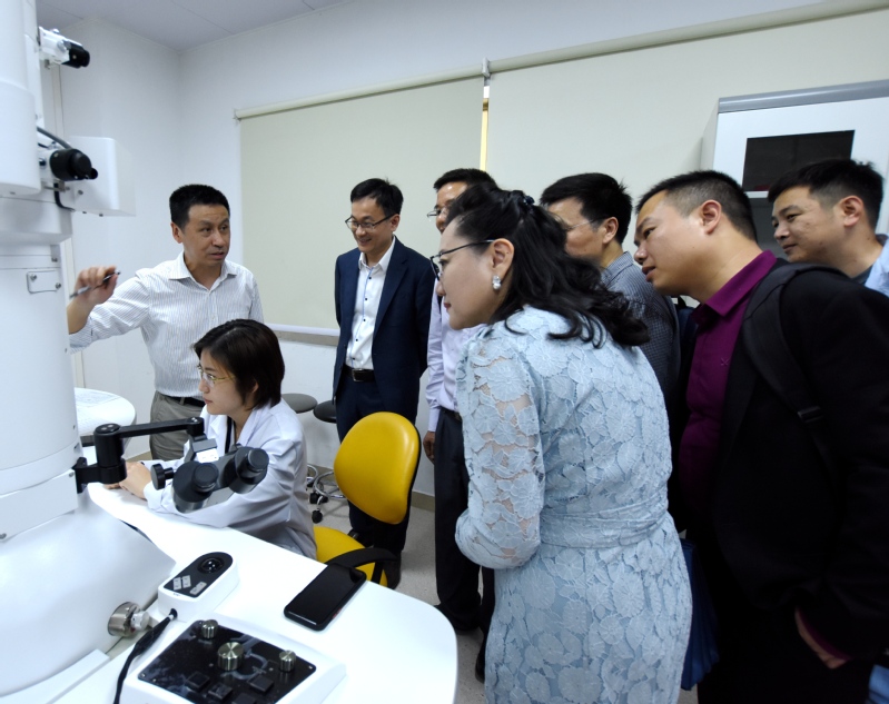 下午,叶子轩一行在李丹院长、实验中心常务副主任周艳晖的带领下进入实验中心仪器平台参观,李丹院长特别对叶氏集团感兴趣的仪器做了生动形象的专业介绍,讲解了X射线单晶衍射仪、透射电子显微镜、高分辨扫描电子显微镜、拉曼光谱和液质联用仪等大型仪器,参观现场气氛活跃,叶子轩先生再次表达了与学院进一步合作的意愿。