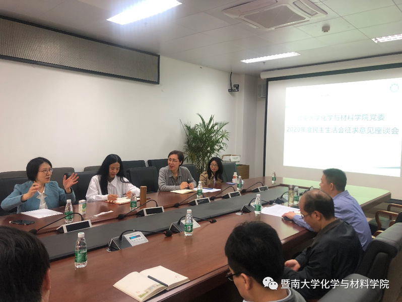 3月11日,在番禺校区学院楼2022会议室,学院按照学校党委开好党员领导干部民主生活会的通知要求、并结合学校党史学习教育的工作安排,以“我为群众办实事,争做贡献暖暨南”为主题,召开了领导班子2020年民主生活征求意见座谈会,组织邀请学院高层次人才、学科带头人、中青年教师、民主党派人士、工青妇团等不同类别的代表共29人参会,虚心听取他们对学院班子和班子成员的意见。为了让大家充分表达意见,座谈会分别以化学系、材料科学与工程系为主体召开了两场。学院党委书记邵桂珍、党委副书记陈文举、化学系总支书记查海燕、主任李毅群,材料科学与工程总支书记容建华、系主任屠美,实验中心常务副主任周艳晖,参加了座谈会。