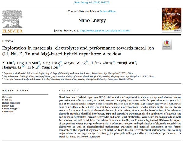 此论文从电极材料设计与制备、电解液的选择和优化以及电化学性能评估方面探讨了基于金属离子(Li,Na,K,Zn、Mg、Al和 Ca)基混合电容器的最新进展和潜在应用,详细介绍了近几年电池型和电容型先进电极材料的分类和储能机理,并依次介绍了水性和非水性电解质(有机电解质和离子液体电解质)的相关发展和应用,进一步归纳多种金属离子基混合电容器的内部结构配置和能量存储转化机理,总结了金属离子基混合电容器在提升电化学性能上的最新研究进展。最后,阐明了这一研究领域面临的主要挑战和未来的发展方向。此综述对于深入探究不同金属离子基混合电容器之间的联系和差别以及最终为制造开发新型高性能储能设备具有重要的指导意义。
