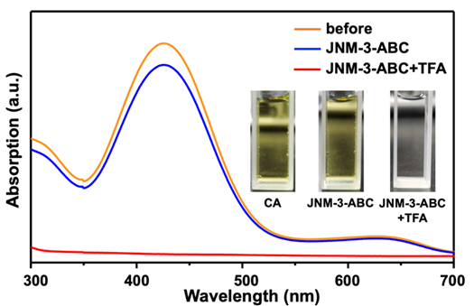 为了进一步验证层间堆积对于吸附能力的影响,研究人员进行了染料吸附实验。实验表明,当铬天青S(chrome azurol S,CA)加入到JNM-3-ABC的悬浮液中,三分钟后仅10%的CA可以被移除;与之相反的是,当铬天青S和TFA(6 M,0.2 mL)加入到JNM-3-ABC的悬浮液中,三分钟后高达99.9%的CA可以被移除(图4)。