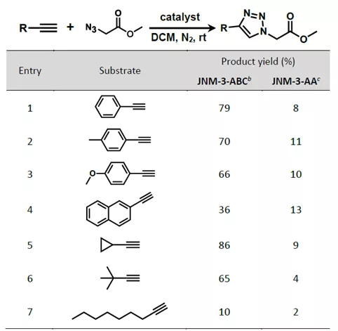 此外,由于堆积方式的不同,JNM-3-ABC比JNM-3-AA具有更多的金属活性位点,从而导致JNM-3-ABC在催化叠氮化物-炔烃环加成(AAC)的反应中具有更高的催化活性。但是,由于较小的孔径,JNM-3-ABC的催化活性也会随着炔烃尺寸的增加而下降(表1)。