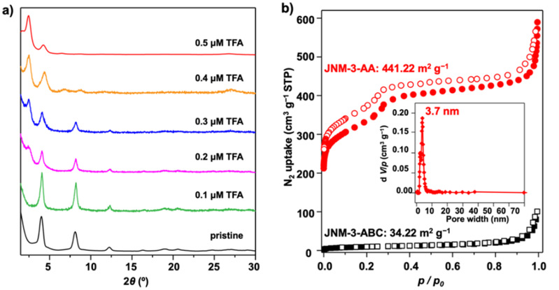 当向JNM-3-ABC的悬浮液中加入不同浓度的三氟乙酸,可以实现JNM-3-ABC向JNM-3-AA的逐渐转变(图3),随着JNM-3-ABC的结构转变过程,其比表面积从34.2 m2/g增加到441.22 m2/g (图3)。通过简单的酸刺激达到大幅提高材料比表面积的例子,鲜有报道。