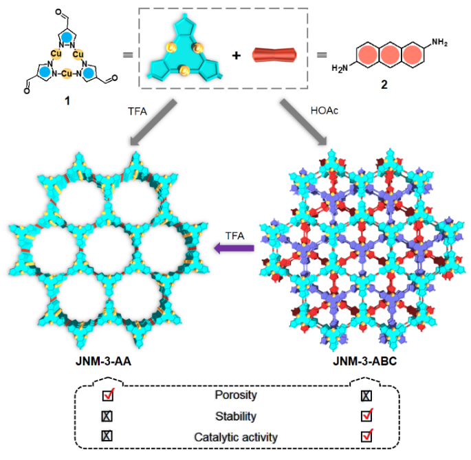 在本文通过环三核配合物(1)和2,6-二氨基蒽(2)之间的亚胺缩合反应制备了一种基于Cu(I)-CTU的二维CMOFs,即JNM-3(图1)。有趣的是,改变有机酸的类型可以调控框架的堆积方式。例如,当选用6 M 乙酸时,得到黄色的ABC堆积结构(JNM-3-ABC);而选用6 M三氟乙酸时,则得到红色的AA堆积的结构(JNM-3-AA)。结合X-射线粉末衍射、N2吸附实验和理论模拟等,确定了JNM-3-AA和JNM-3-ABC的层间堆积方式、BET比表面积和孔径分布。结果显示JNM-3-AA和JNM-3-ABC的BET比表面积分别为695.3 m2/g和34.2 m2/g ,孔径为∼3.70 nm和∼1.50 nm,与理论结构中孔径近似。