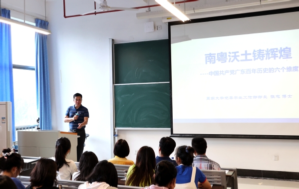 为了深入推进党史学习教育,5月14日,vwin德赢ac米兰官网党委特邀vwin德赢ac米兰官网党委委员、党委学生工作部张志部长,为学院本科学生党员和入党积极分子做了一场《南粤沃土铸辉煌——中国共产党广东百年历史的六个维度》的专题讲座。张志部长提纲挈领,将中国共产党在广东100年的丰厚历史浓缩成“发展史”“创业史”“奋进史”“自我革命史”“奋斗史”“践行史”六个方面,进行了视野宏阔、条理清晰、言近旨远的阐述和讲解。vwin德赢ac米兰官网党委书记邵桂珍主持讲座,学院党委副书记陈文举,辅导员以及学生党员、入党积极分子近100人参加活动。