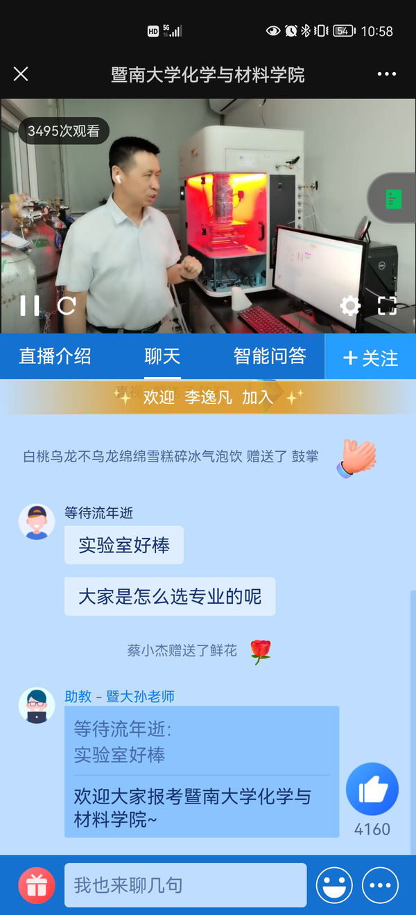 直播首先展示了学院宣传短片,随后,李丹分别从化学、材料学科的历史沿革,学院组织架构、师资队伍建设、学科建设和本科生就业升学情况、人才培养特色等方面对学院进行了详细介绍,内容丰富、干货满满。