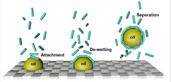 在该项研究中,首先利用天然埃洛石纳米管(HNT)作为 Pickering 乳液油水界面的稳定剂。系统研究了HNT的基本理化性质、Pickering乳液中的稳定机制、不同基材上的去污效率、HNT对植物的毒性以及纺织品上的残留。HNT对附着在基材表面的油的去润湿过程如图1所示。HNT作为Pickering乳化稳定剂,在油水界面逐渐被吸收,洗涤运动产生的对流力大大克服了清洗过程中油污与基材表面的附着力,将油污从基材表面去除。另外,油从表面释放出来后,HNT作为稳定剂紧密排列在油水界面,稳定油滴,使油滴难以重新附着在基材表面,达到良好的去除效果。