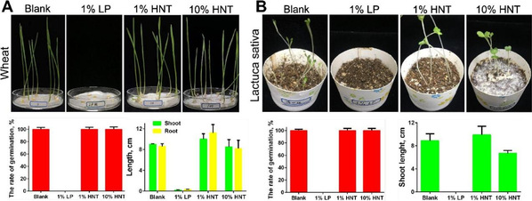 图4. HNT 和 LP 的植物毒性研究(第7 天):小麦 (A) 和莴苣 (B)的生长情况