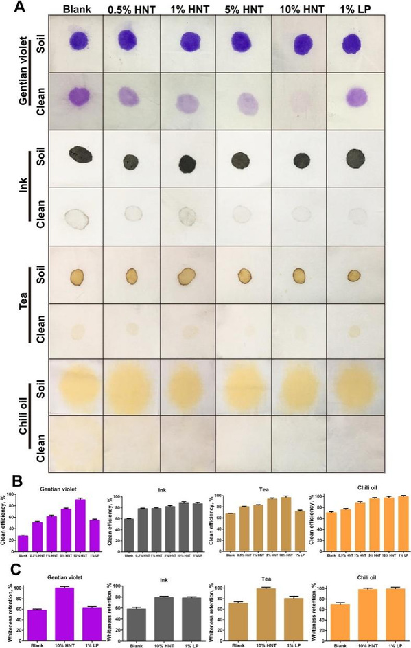 图2. HNT 的清洁能力研究:从白色棉织物中去除不同染料、墨水、茶和辣椒油(A),清洁效率(B)和白度保持率(C)
