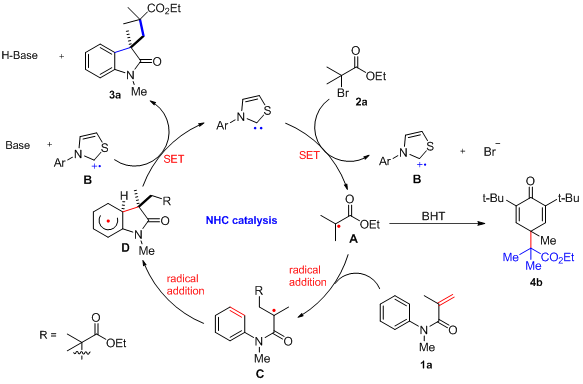 最后,作者还进一步研究了这一反应的可能机理(图3):N-杂环卡宾作为单电子还原剂和催化剂,向a-溴代羧酸酯提供一个电子,从而产生NHC自由基阳离子中间体B和相关的a-碳自由基A,作者通过自由基捕捉实验证明了这一点。自由基A加成到碳–碳双键上会生成碳自由基C,然后碳自由基C迅速进行另一次分子内自由基加成,形成中间体D。随后,碱进一步促进均相芳香取代反应顺利发生,并进行第二次SET过程。伴随着D的去质子化,得到具有季碳中心的吲哚酮产物,并完成催化循环。