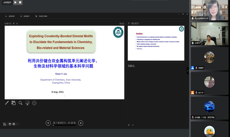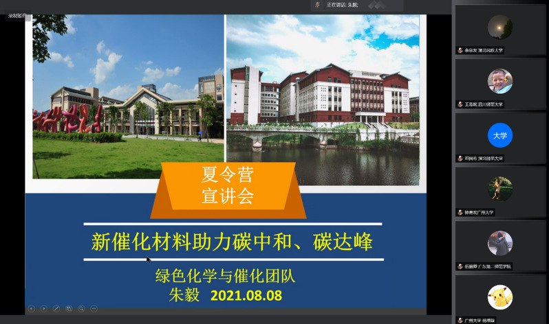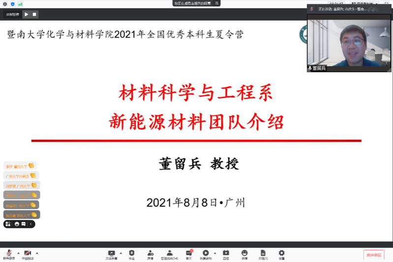8月8日下午,来自超配所配位化学研究所、化学系和材料科学与工程系共8个科研团队的代表:宁国宏教授、徐石海教授、朱毅副教授、刘春元教授、李风煜教授、李立华教授、刘明贤教授及董留兵教授分别进行了介绍分享。各位老师毫无保留地对学习、科研、生活和工作进行了讲解,并积极回答了营员关注的一系列问题,增加了营员对研究团队的研究方向、师资水平、实验平台等全方位多角度的认识。