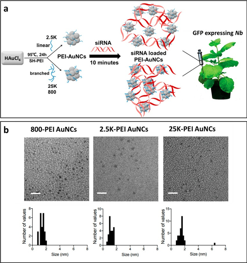 图2、PEI功能化的金纳米簇的合成及表征。a,种子法合成不同分子量PEI修饰的金纳米簇,静电吸附法装载可沉默GFP的siRNA并运送至植物细胞;b,三种不同分子量大小的PEI-AuNCs的TEM表征及尺寸统计。