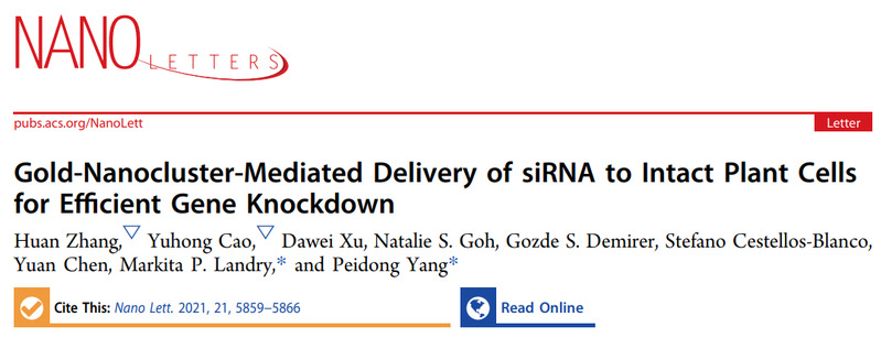 RNA干扰(RNAi)技术的出现,使的在转录组水平上对植物进行经济快速有效的基因操作成为可能,进而可以进一步了解细胞代谢、分析基因功能、生产改良作物品种、保护作物免受害虫的侵害。RNAi技术的主要策略是将外源性小干扰RNA(siRNA)递送到细胞质中,这在植物研究中是一个重大挑战。不同于动物细胞,植物细胞外面有着一层致密的细胞壁,它的存在使得外源生物分子的递送金变得非常困难。而纳米团簇(AuNCs)由于本身尺寸很小,仅有约1-2nm,远低于细胞壁的尺寸限域范围,因此有机会可以透过细胞壁进入植物细胞。