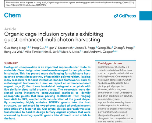 近日,vwin德赢ac米兰官网,超分子配位化学研究所宁国宏教授与利物浦大学的M. A. Little、A. I. Cooper教授合作课题组在Cell姊妹刊Chem(IF:22.804)上发表了题为“Organic cage inclusion crystals exhibiting guest-enhanced multiphoton harvesting” 重要研究成果。论文通讯作者是宁国宏、M. A. Little、A. I. Cooper; 第一作者是宁国宏;第一通讯单位为vwin德赢ac米兰官网。