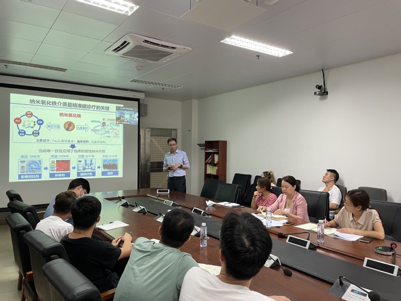 下午,樊海明教授在番禺校区化材楼2022会议室,进行主题为“纳米氧化铁与精准磁诊疗”的学术讲座,全院近30名师生前来聆听,讲座由李红主持。樊教授从研究背景、磁共振成像与准顺磁对比剂、磁热治疗与涡旋磁氧化铁等方面,展示了研究进展和成果。