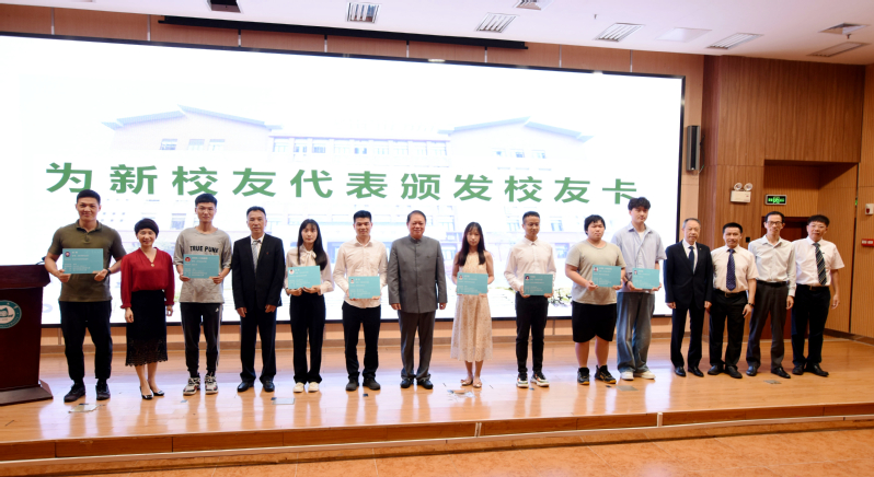 (vwin德赢ac米兰官网校董学院校友联谊会名誉会长梁仲景、vwin德赢ac米兰官网对外联络处处长校友总会秘书长梁燕、学院校友联谊会名誉会长黄耀佳、学院校友联谊会会长龙卓飞、学院院长李丹等为学院2022届毕业生代表颁发校友卡)