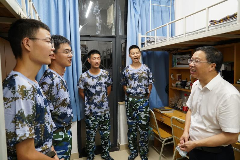 “你们学的什么专业?家乡是哪里的?大学生活还适应吗?”在走访宿舍的过程中,宋献中与学生亲切交谈,详细询问同学们到校的过程及军训开展的情况,叮嘱大家要珍惜军训机会,从意志品质、纪律作风等方面严格要求自己,为即将开始的学习生活打下良好的基础。