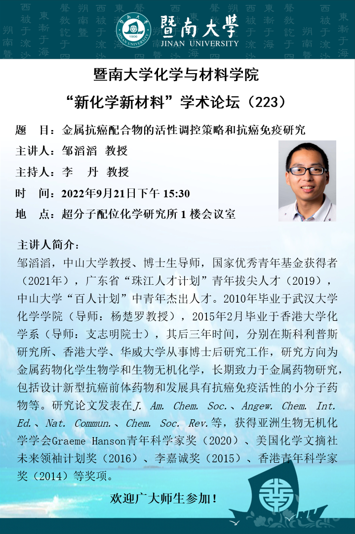 题 目:金属抗癌配合物的活性调控策略和抗癌免疫研究